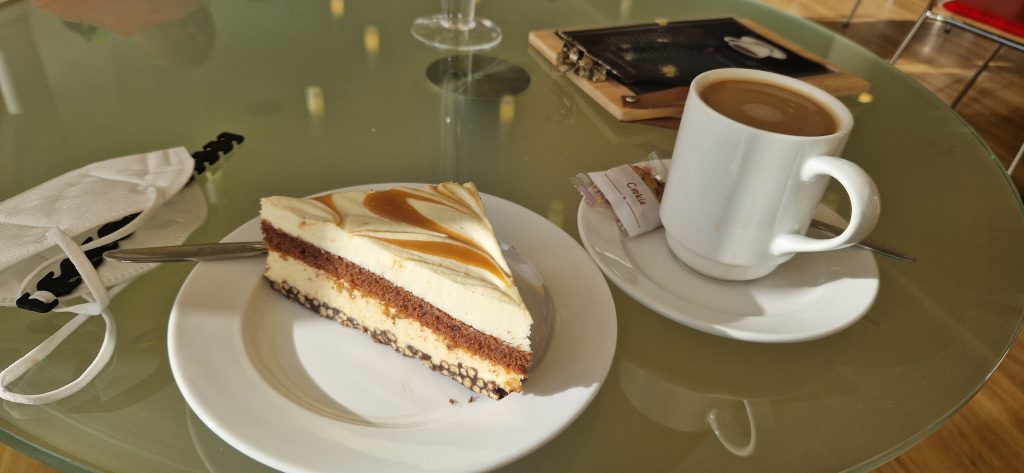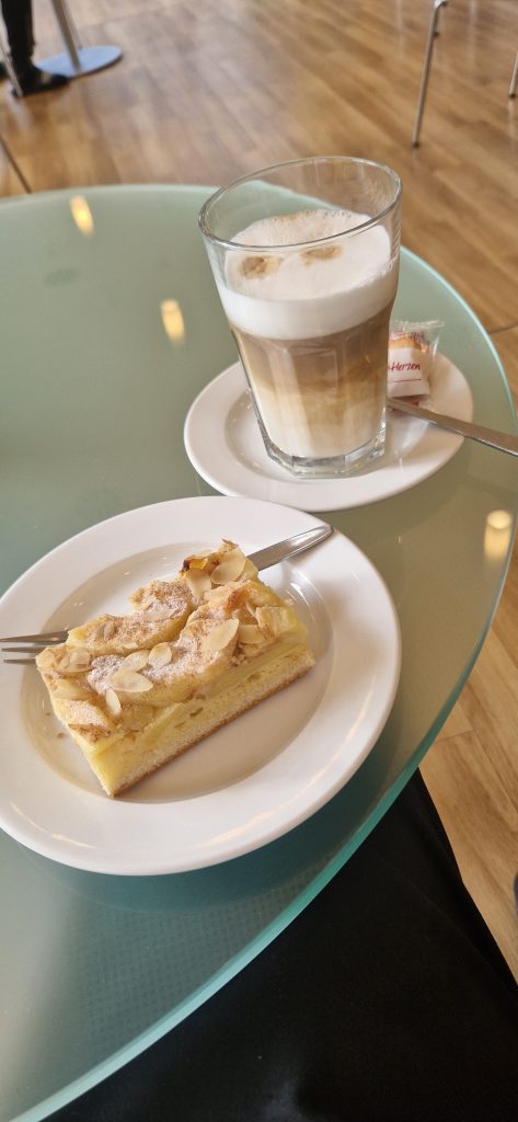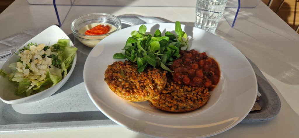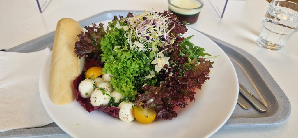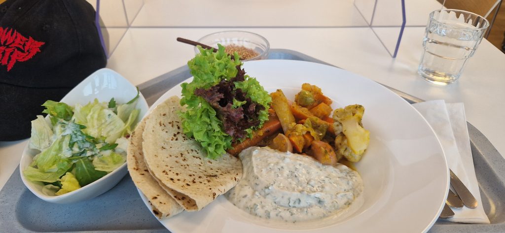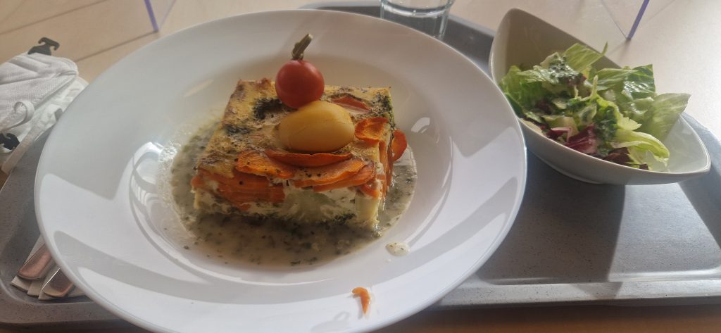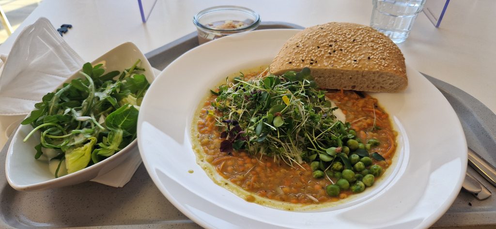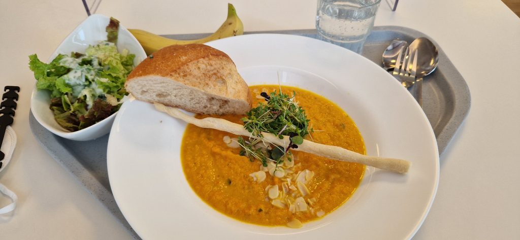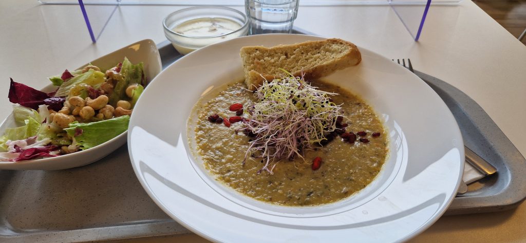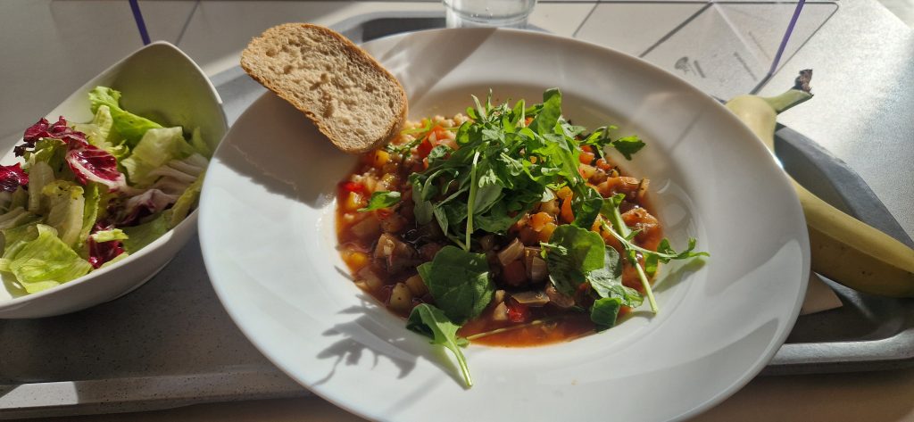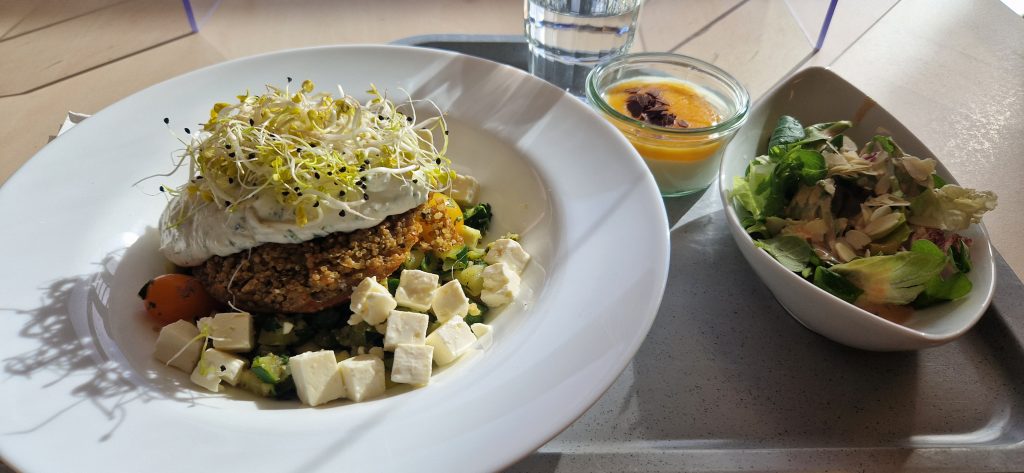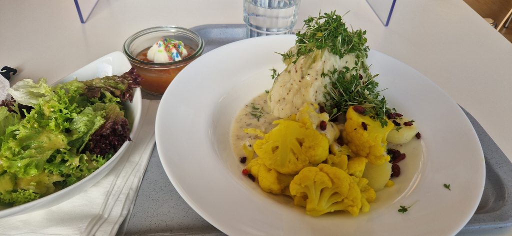 Nun komme ich zum Mittag. Ich muss gestehen, dass ich eigentlich ein „Picky-Eater“ bin. Also meine Auswahl an präferierten Lebensmitteln ist etwas speziell. Also hatte ich Angst, hier nicht wirklich was zu finden was ich auch mag. Es stehen Mittags 2 Menüs zur Auswahl. Immer ein vegetarisches Menü ist dabei. Manchmal sind auch beide Menüs frei von Fleisch. Generell wird hier alles frisch gekocht und möglichst regionale, saisonale Zutaten verwendet. Einen Kritikpunkt einiger Mitpatienten habe ich aufgeschnappt: es ist generell schon sehr fleischarm was hier angeboten wird. Für mich als Vegetarier ist dies aber eher von Vorteil. 😊 Es steht jeden Mittag jemand von der Ernährungsberatung für Fragen und Sonderwünsche (z. B. bei Unverträglichkeiten…) mit Rat und Tat zur Verfügung. Es gibt immer verschiedene Salatoptionen als Vorspeise und auch immer ein Nachtisch steht bereit. Manchmal gibt es Eis, manchmal Obst.